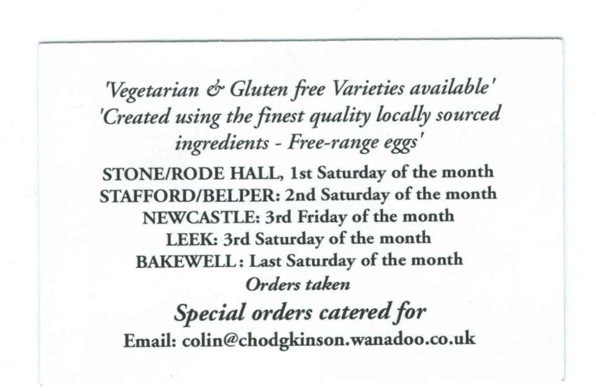 They are based out of the Woodlane Farm in Stanley Staffordshire and appear regularly at the Markets in Bakewell, Stone, Stafford, Belper, Newcastle, and Leek. The dates on which they are there is on the back of their card.
