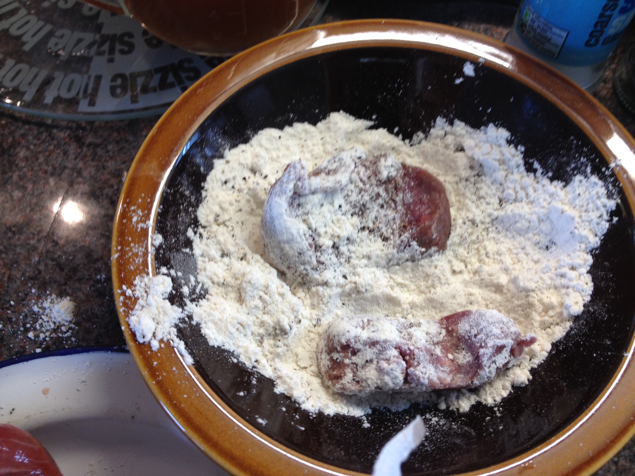 First off we dipped the chopped camel leg into some plain flour mixed with a liberal dose of salt and pepper.