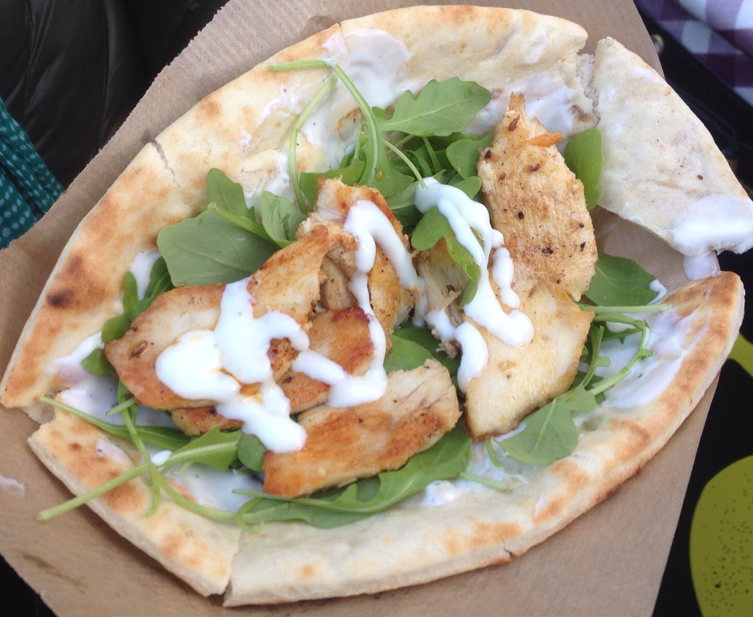 I had one of their Spanish Chicken filled ‘Boccas’ for £5. This was a lightly toasted pitta type wrap filled with a plentiful mound of chicken that had been grilled in the Spanish style. The chicken was coated with a blend of smoked paprika, oregano, cumin and lemon, the bed of the wrap was filled up with a very large handful of crunchy rocket which was a good accompaniment to the chicken adding a little texture to the bite and pepperiness to the taste. On the top I added a splash of their homemade balsamic vinegar mix, and a generous dollop of their lemon and garlic yoghurt dressing. It was a seriously good sandwich, not only was it filling, it was damned tasty, and it also felt almost healthy. The only thing I would have changed would have been to make sure that more of the chicken filled the bottom of the wrap so that you got a bite of chicken, rocket., and yoghurt with each bite.