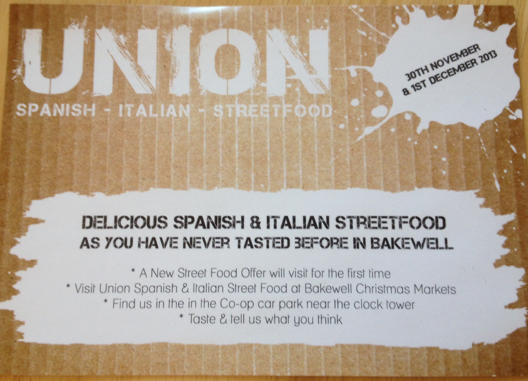 This past weekend I was over in Bakewell visiting their Christmas Market which was just running over that weekend. When we headed up to the square behind the co-op where the food stalls were, well I will be honest I was not feeling too hopeful, that was until I picked up a Flyer from the Union Street Food pop-up stall. This was the first run out of a ‘Spanish and Italian inspired StreetFood’ venture by the guys behind the local Wyes Waters Tea Rooms.