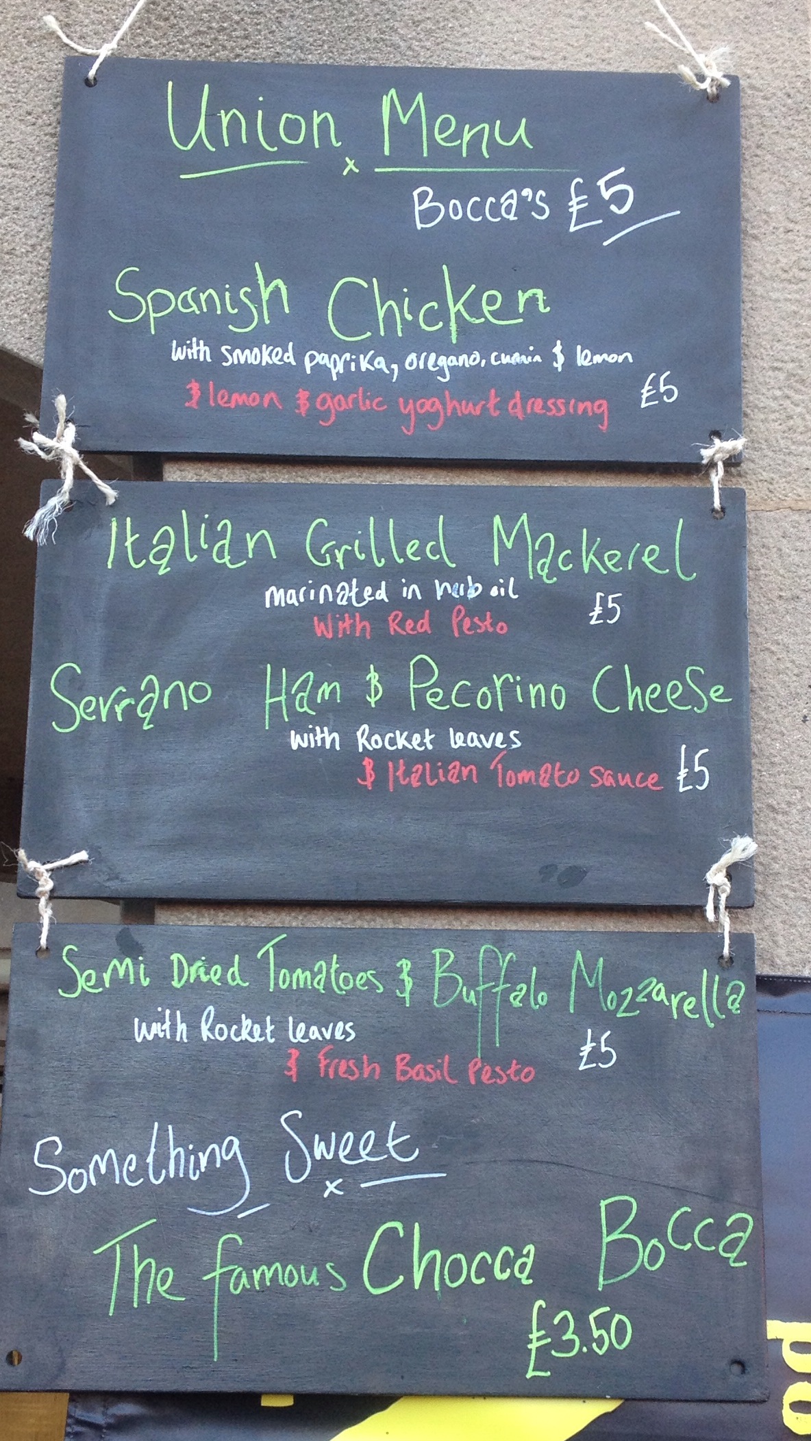 The Union Menu chalkboard stood out like a shining beacon in amongst the sad burger and pie stalls. There were plenty of people stuffing their faces at the troughs of average, but when it came down to finding something more original in the square? well the Union Street Food stall won the competition easily.