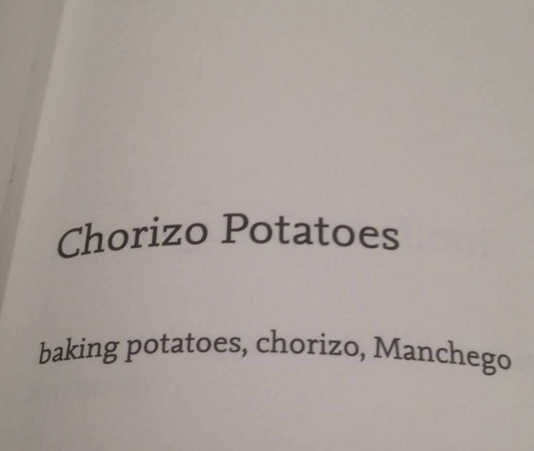 It is around this time of the year that the fridge is full of leftovers and we are trying to eat our way through the freezer so that we can restock with more farmers market goodies. I was rummaging around in the back of the fridge and found a solitary chorizo link and a rather small piece of Manchego cheese. What can I do with these I pondered, then I remembered a conversation about a Chorizo potato dish featured in Nigel Slater’s latest book offering ‘eat’