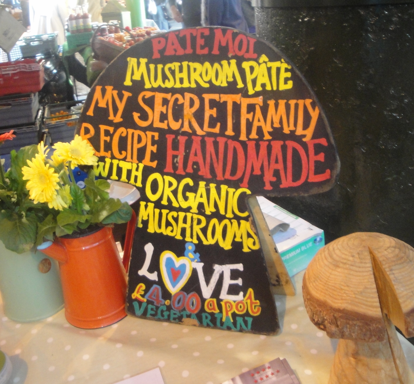 The Borough Market website describes it thus “Flip Dunning’s hand-made organic mushroom pâté, made to a secret family recipe from just-picked field, button, chestnut and in-season wild mushrooms. This vegetarian treat works perfectly on toast, but also makes a wonderful stuffing for chicken breasts, a spread for a bacon sandwich, or a flavoursome addition to rice, pasta or potatoes.”