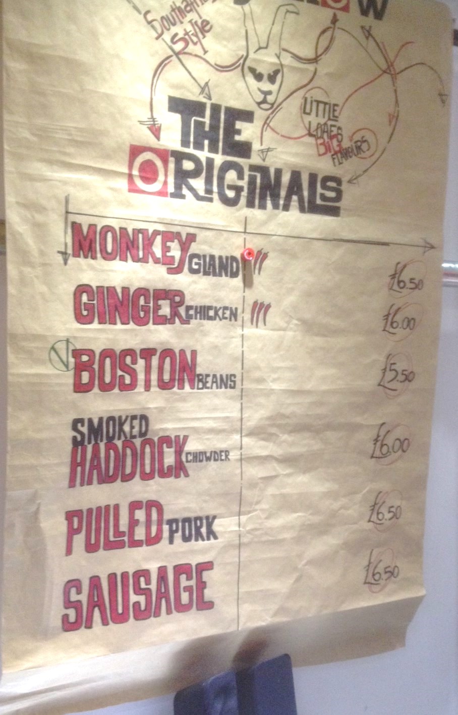 The menu listed some filling items that made sense such as “Pulled Pork” and “Smoked Haddock Chowder”, but ‘Monkey Glands’? What are ‘Monkey Glands’ when they are at home? Well according to the girl on the counter these are “Meatballs smothered in South African monkey gland sauce” but not made of actual Monkey Glands she insisted. Typically this sauce is made from chopped onion, garlic and ginger, and then a mix of chutney, soy sauce, mustard, worcestershire sauce, ketchup, and wine. I couldn’t get the Bunnychow recipe but it was probably along those lines.