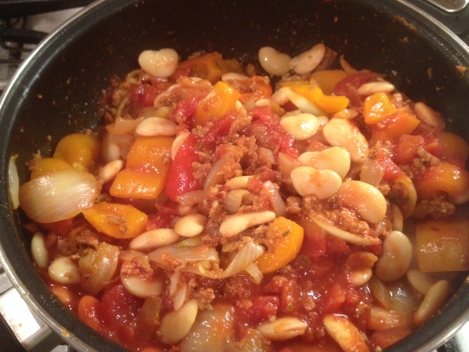 If you don’t buy the book, you wont go far wrong if you just chuck onions, peppers, chorizo sausage, butter beans and tomatoes into a pot.