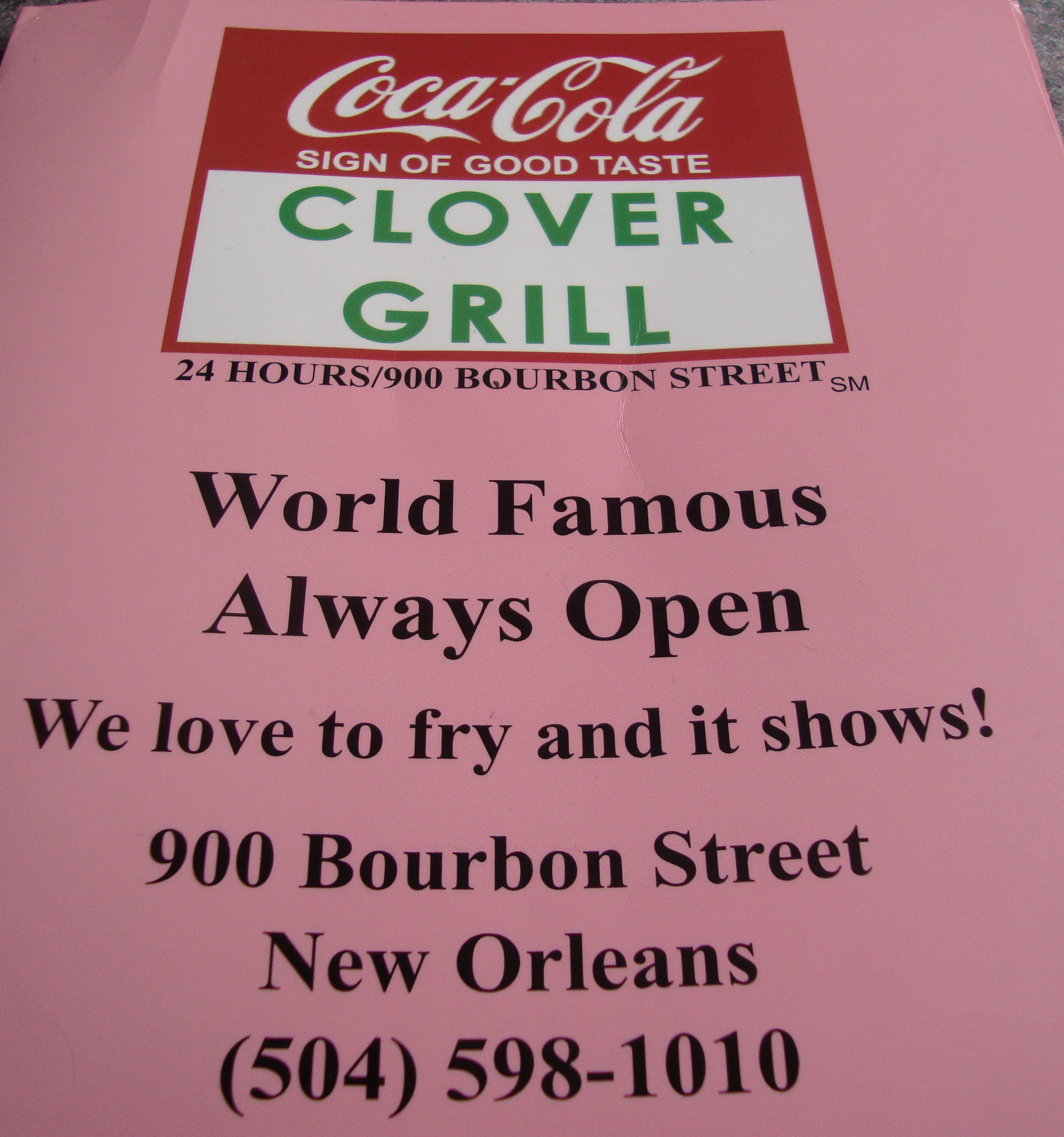 Clover Grill is located at 900 Bourbon Street you can find the menu and read more about them on their website and also check them out on Facebook