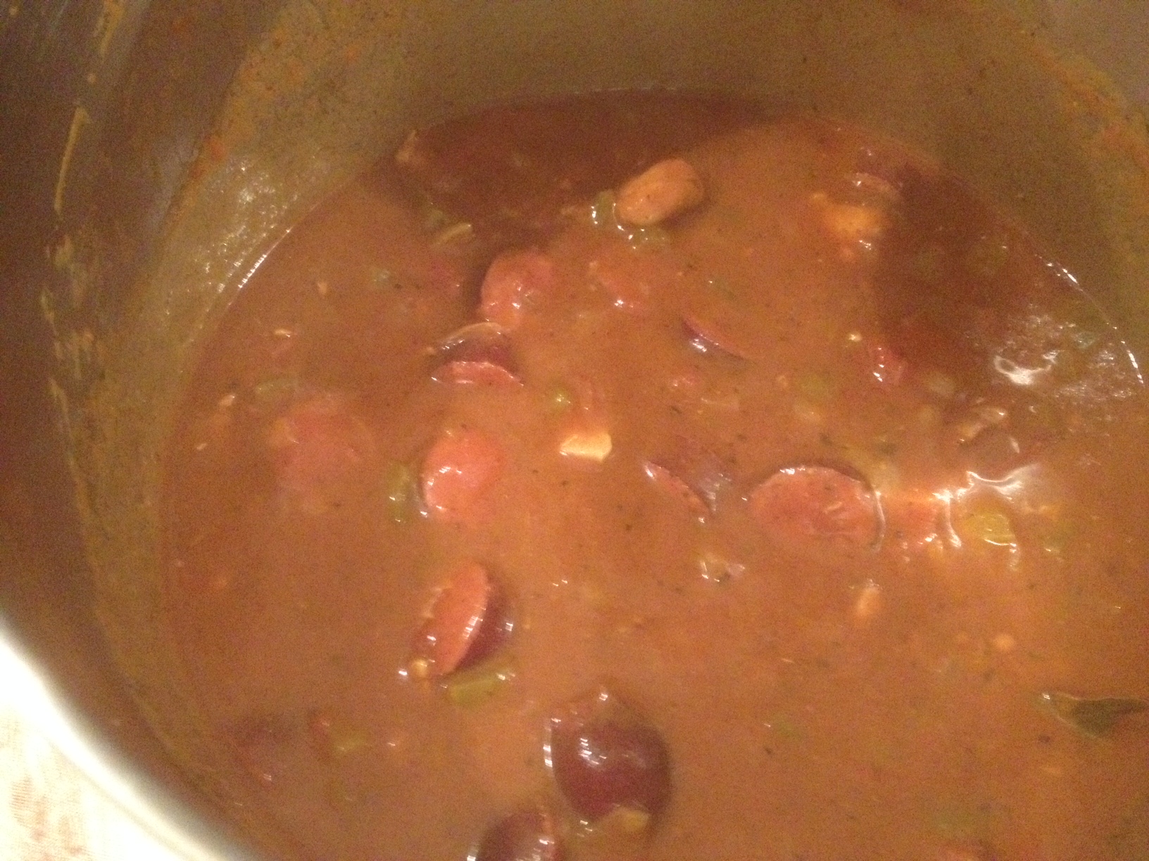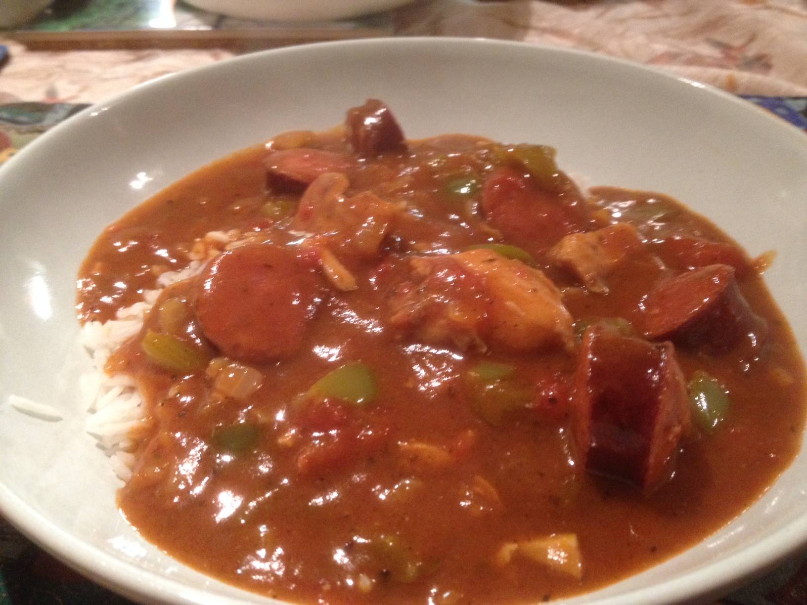 “Boneless chicken, Andouille (a Cajun Sausage), okra and seasonings simmered in