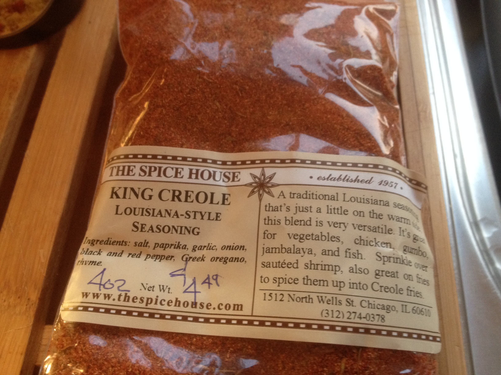 The Spice House King-Creole Louisiana-Style seasoning is a spice blend hand mixed from: salt, paprika, high bulk garlic, onion, black and red pepper, Greek oregano, thyme