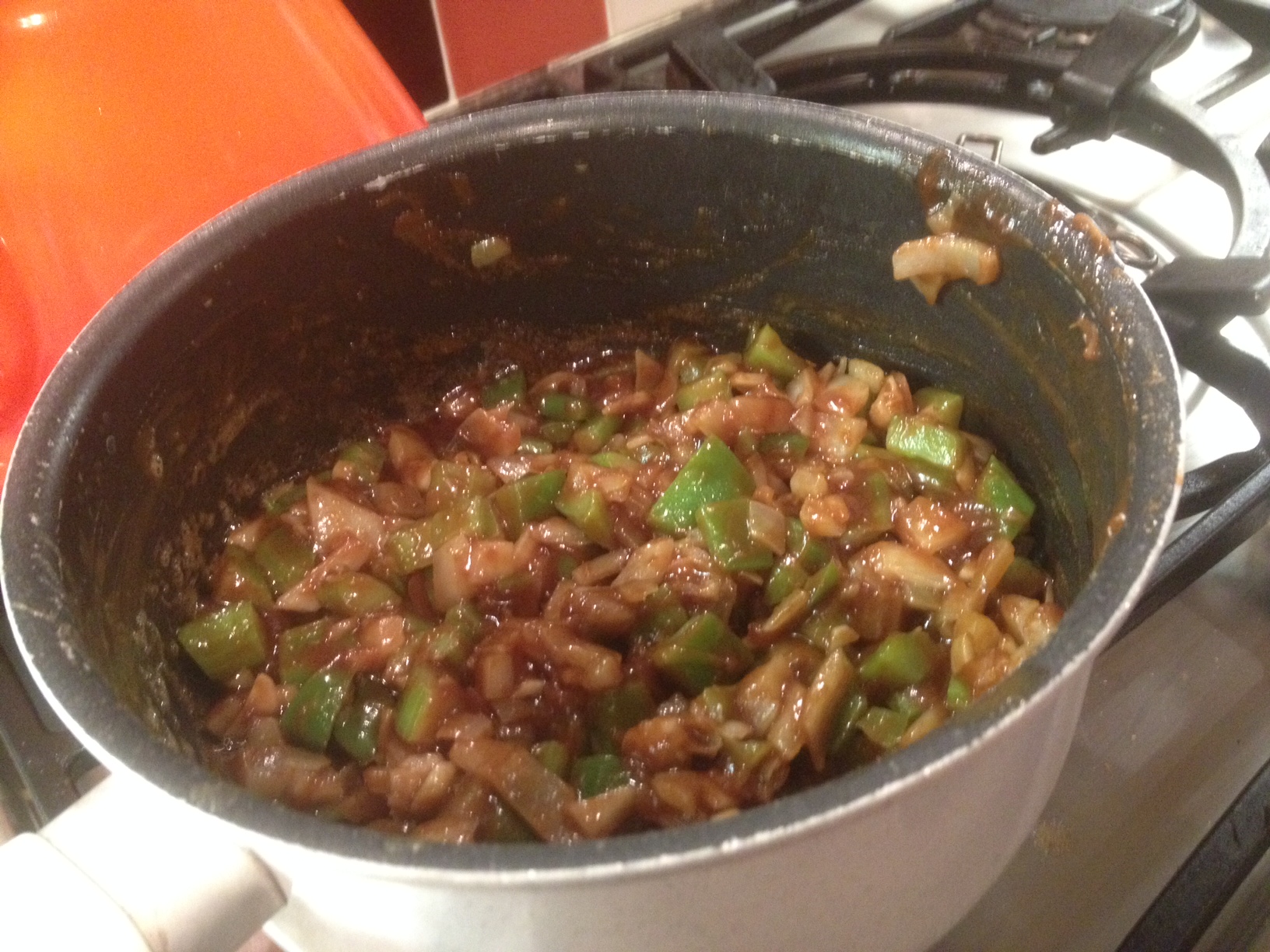 The next cooking stage was a little less traditional in that we mixed the holy trinity with the roux. The recipe indicate to ‘sauté until vegetables are tender‘ and advises to ‘allow the vegetables to stick to the bottom of the pan a bit, then scrape them off with a metal spoon or spatula. This allows the sugar in the onions to carmelize, rendering a great depth of flavor.‘