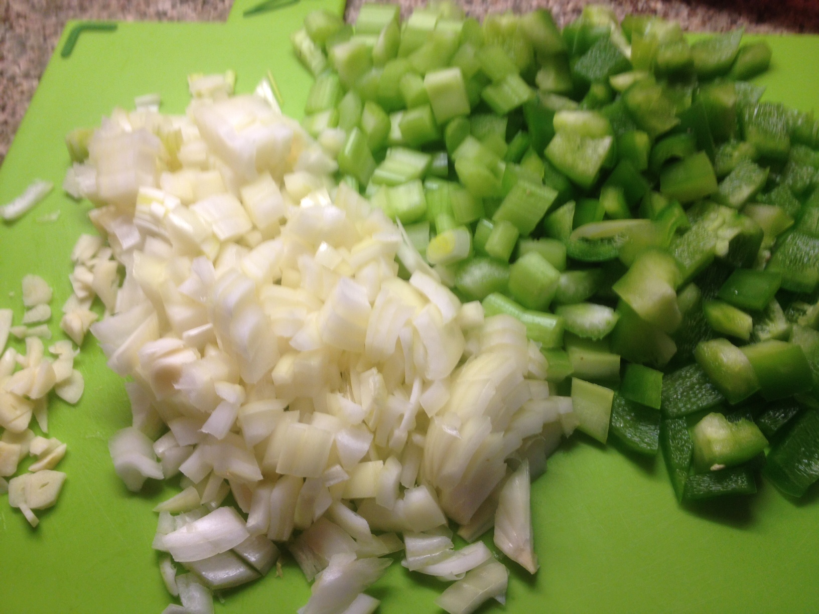 In between hand burning we got the ‘Holy Trinity’ prepared; ‘onion, celery, bell pepper’ and a fair bit of garlic.