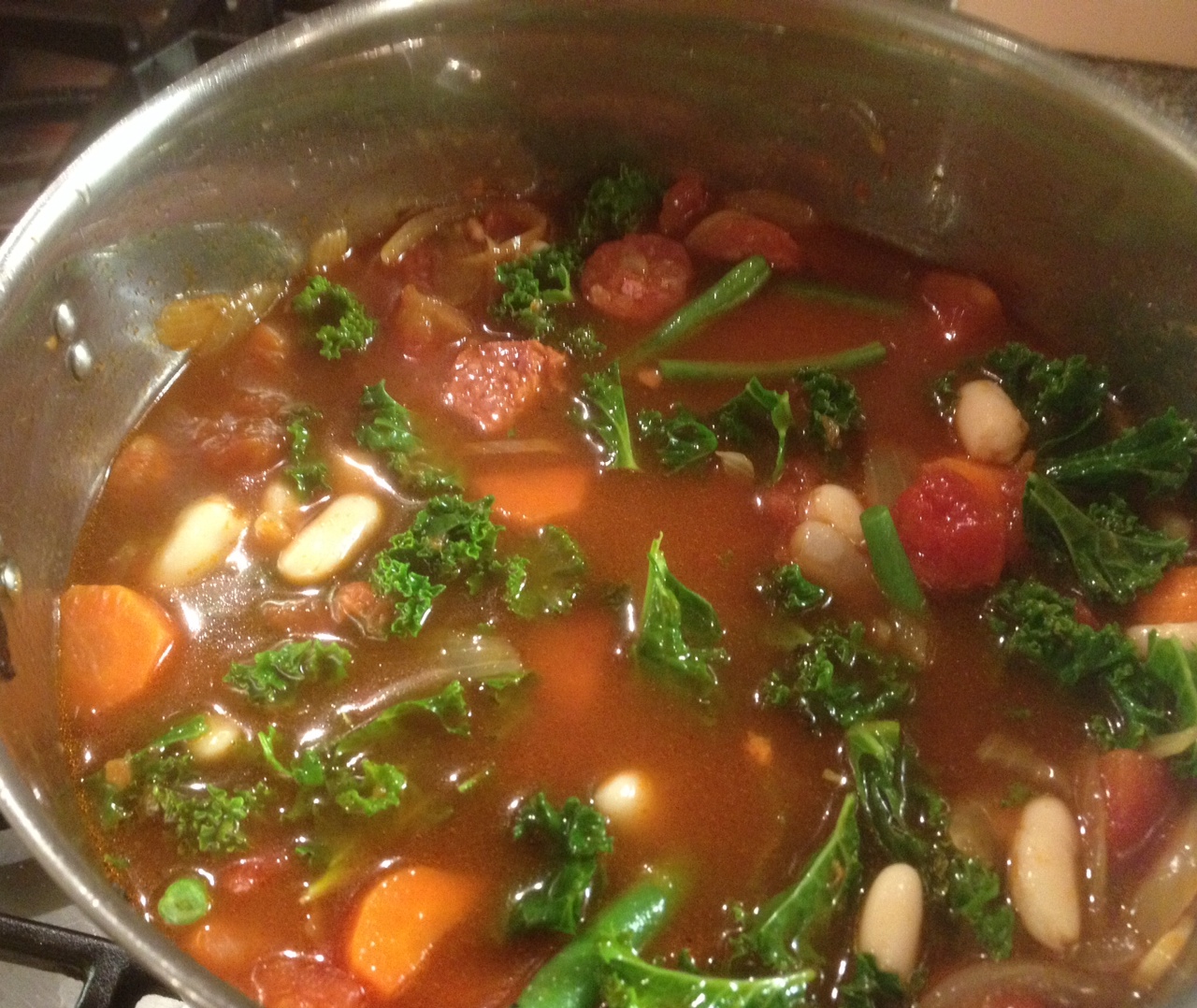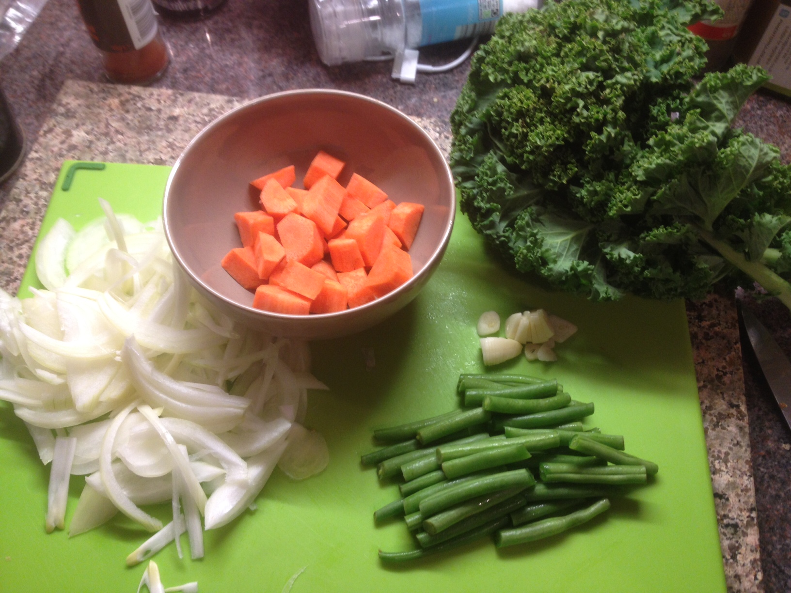 On the vegetable front it was a medium onion, a couple of cloves of garlic, a handful of green beans (about 100g), a couple of chopped carrots, and a big handful of chopped kale. The book recipe was for 6 people but I cut it down a bit for two with a couple of spare portions for the freezer.