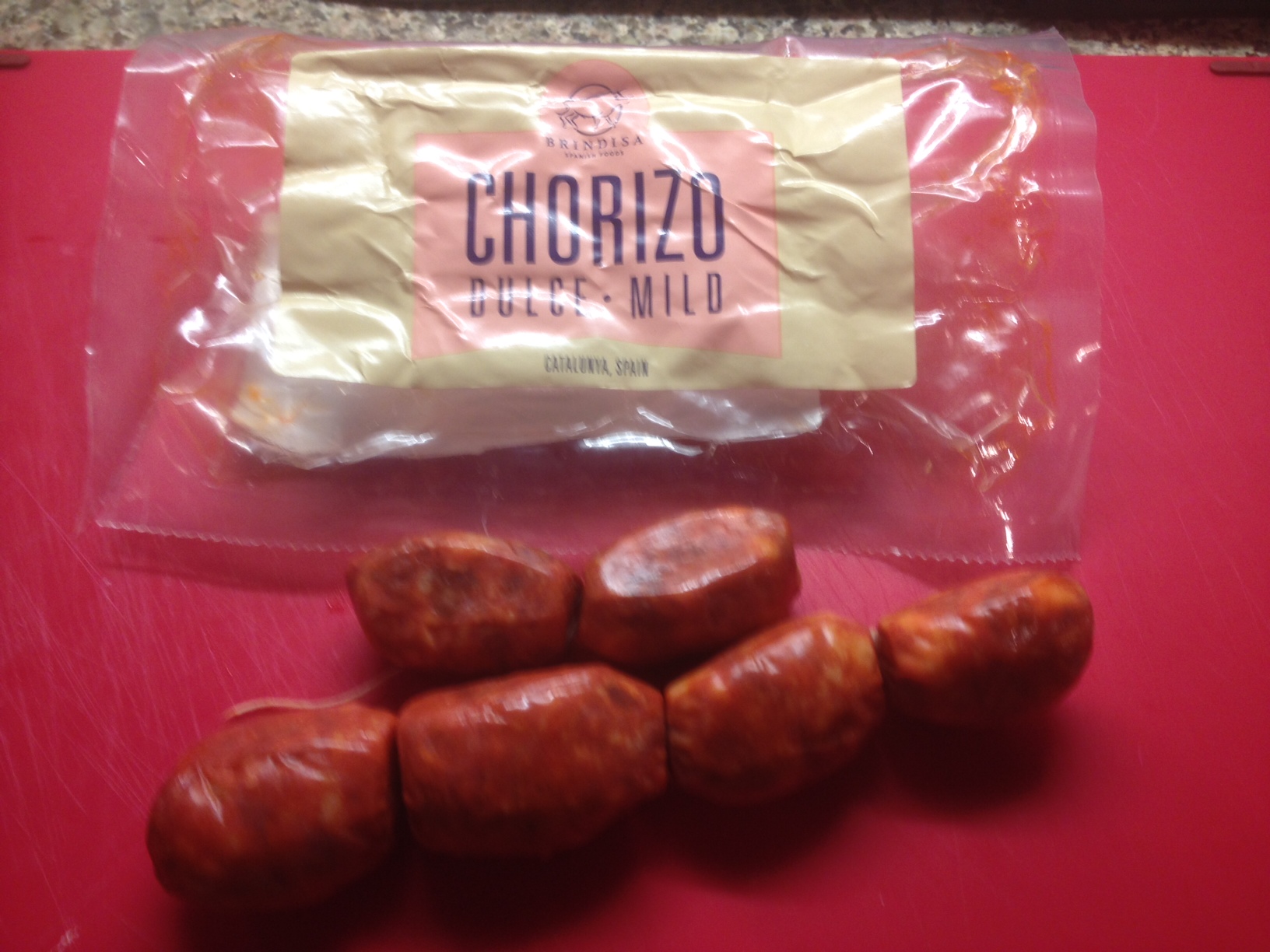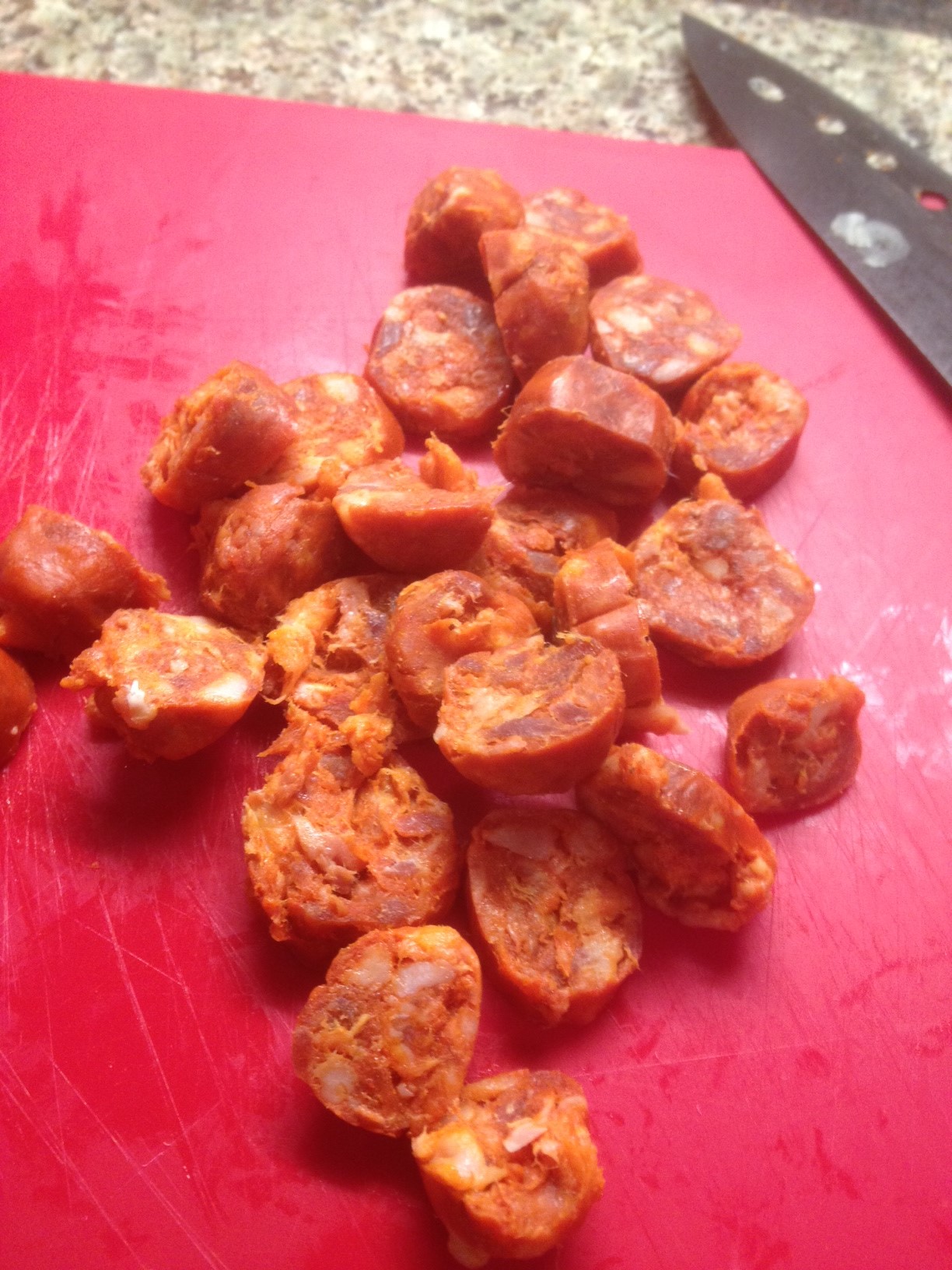 I bought my Chorizo sausage from, Brindisa on the Borough Market in London, I picked out the Dulce Mild which they describe as Bite size paprika-rich chorizo pieces. To me it was a link of little chorizo sausages. The filling is quite loose and crumbly and packed with flavour and I was quite tempted to just eat them as they were. They recommended that you should ‘Pan fry with a splash of cider or red wine, and then serve in terracotta dishes with crusty bread to soak up the lovely juices’. I kind of wish I had done that now! But I didn’t and they were to make this soup totally fantastic