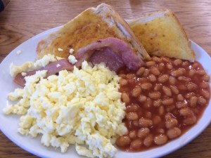 The “All day mini breakfast” at the Coffee Pot did actually look to be pretty healthy as greasy spoon café fare goes. Billed on the menu as “All day mini breakfast, bacon, scrambled egg, beans, toast” it was really a large plate of egg and beans with some toast and a kind of bacon garnish 🙂 Fair enough!