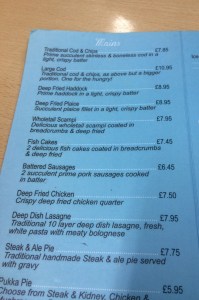 Castaways has a pretty reasonably priced menu if you fancy sitting down for your Fish and Chips by the seaside. It also caters for the fussy buggers amongst us offering up Battered Sausages and Chips, Pukka Pies and even a Deep Dish Lasagne (ooh it’s just like being in Italy) 🙂