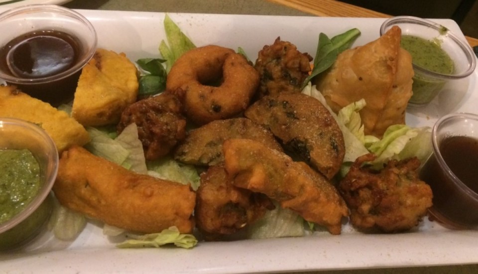 We had the mixed starter platter for $10.95 which was a plateful of all the stodgy stuff, that I usually like, but here it all seemed to be too much food to scoff. The plate was filled with Vegetable Pakora, Paneer Pakora, Samosa, Tikki, Chilli Bharjji, and Medhu Vada