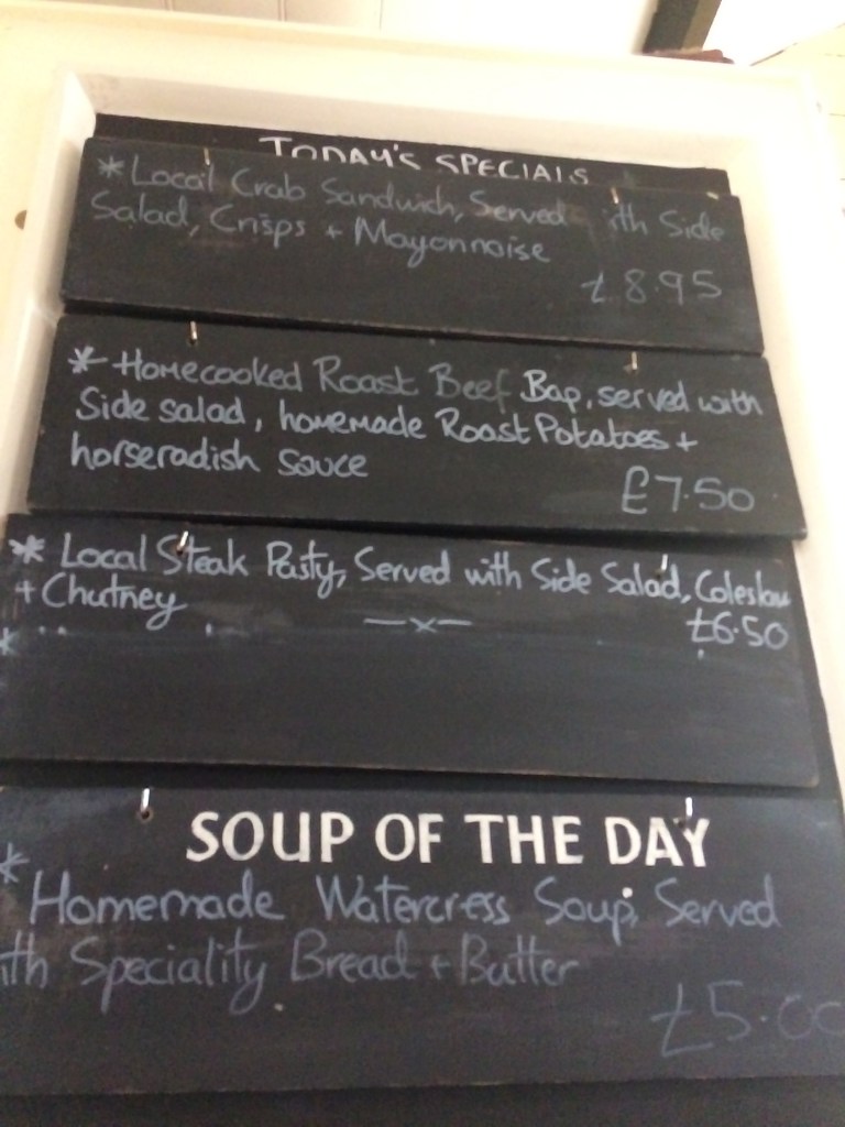 The specials board at the Tea Room has what you may well have expected here in Cornwall by the coast, offering Local Steak Cornish pasties and Crab Sandwiches