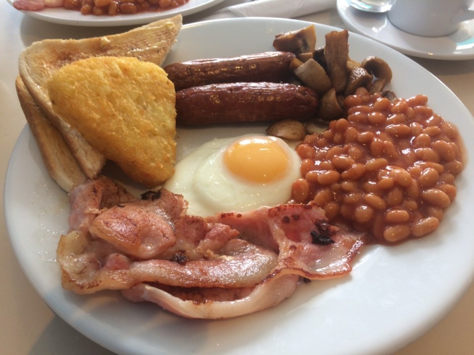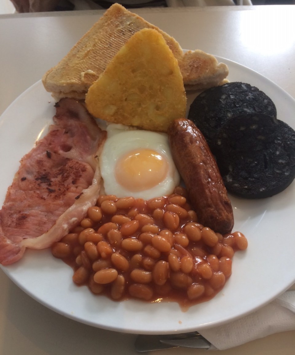2 bacon, 2 Fried eggs, 2 sausages, Mushrooms, Black pudding, Beans, 2 Toast” for £6.50