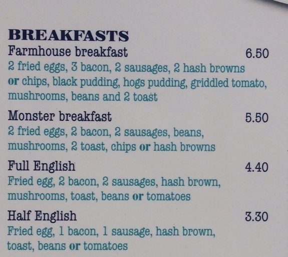 The Farmhouse Breakfast was listed as being “3 bacon, 2 Fried eggs, 2 sausages, Mushrooms, Black pudding, Hogs pudding, Grilled Tomato, Beans, 2 Toast, 2 Hash Browns or Chips” for £6.50