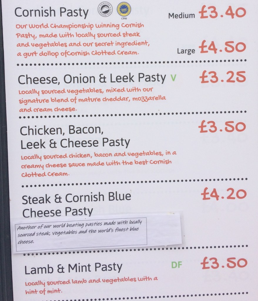 The Traditional Cornish Pasty at The Chough Bakery was described as “Our World Championship winning Cornish Pasty, made with locally sourced steak and vegetables and our secret ingredient a gurt dollop of Cornish Clotted Cream”