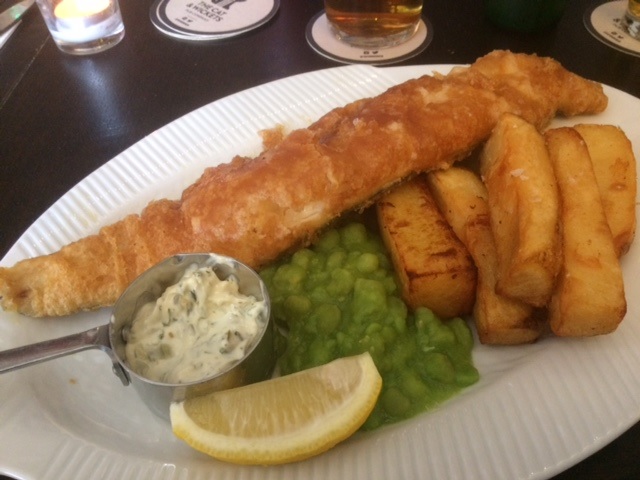 We perused the Classics section of the menu and saw that they were offering “Beer battered Haddock, chips in dripping, mushy peas & tartare sauce for £12.50“.