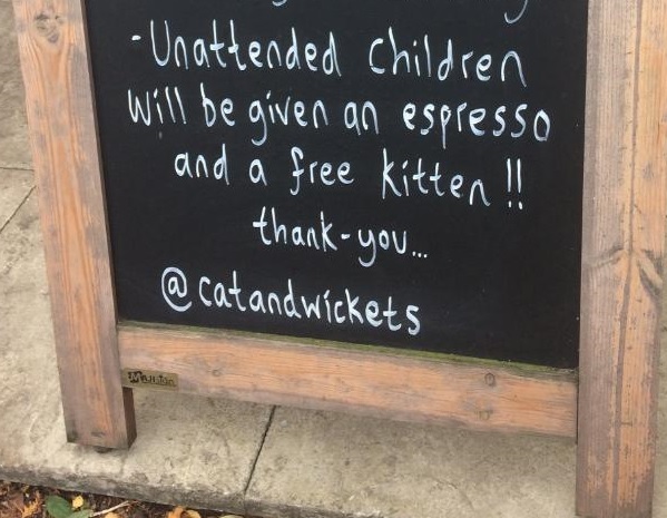 I loved this chalkboard out in the car park suggesting that unattended children will be given an expresso and a free kitten. Well technically I was an unattended child but I didn’t go back in to make my claim!
