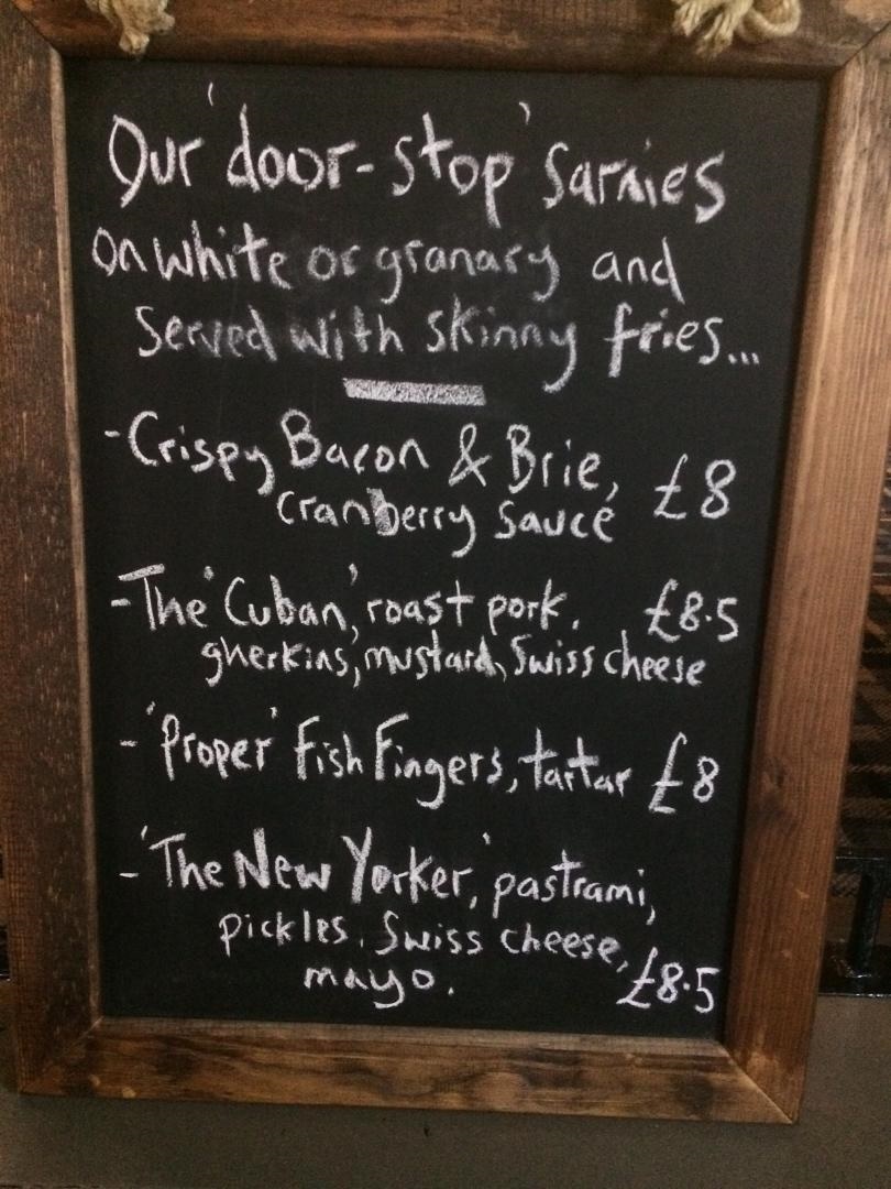 When I walked in the first thing to jump out at me was their Chalkboard listing “Our ‘door-stop’ sarnies”. I always love a proper big sandwich and these sounded great all made with white or granary and served with skinny fries.