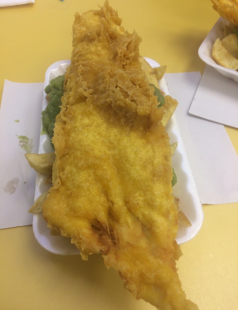 This was a seriously decent sized portion, it was almost overwhelming! The piece of haddock was huge and covered in a nice crisp batter. It was perched on top of a large tray of chips and mushy peas, so it took a while to eat through enough fish to get to the chips.