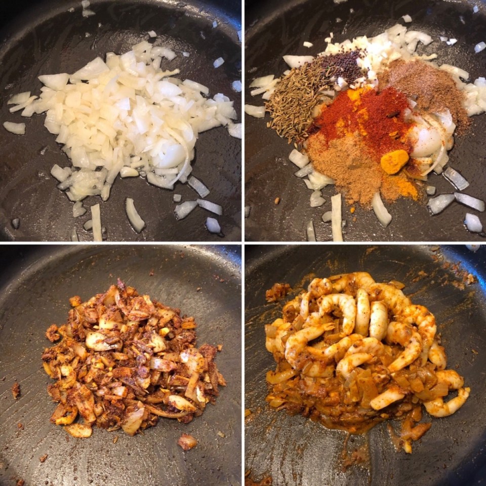 Making this curry is really easy, first off slowly cook a chopped up medium onion until it is soft. Then chuck in all of the spices and the garlic. Mix them all up with the onion and cook for a few minutes to let the spices warm up and release their flavours.