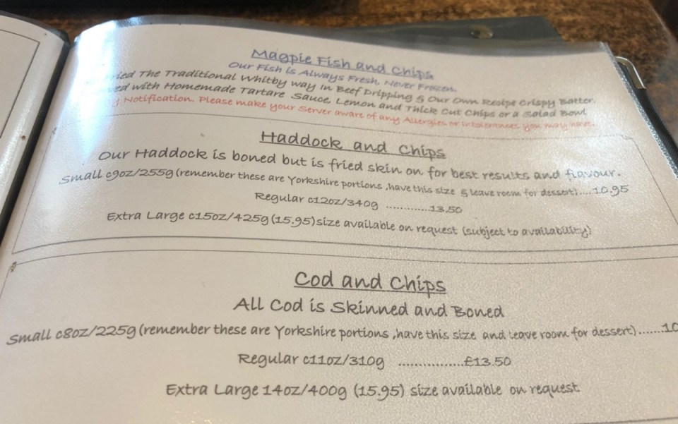 The menu said that the fish was “fried the Traditional Whitby way in beef dripping and our own recipe Crispy Batter served with Homemade Tartare Sauce, Lemon and Thick Cut Chips”