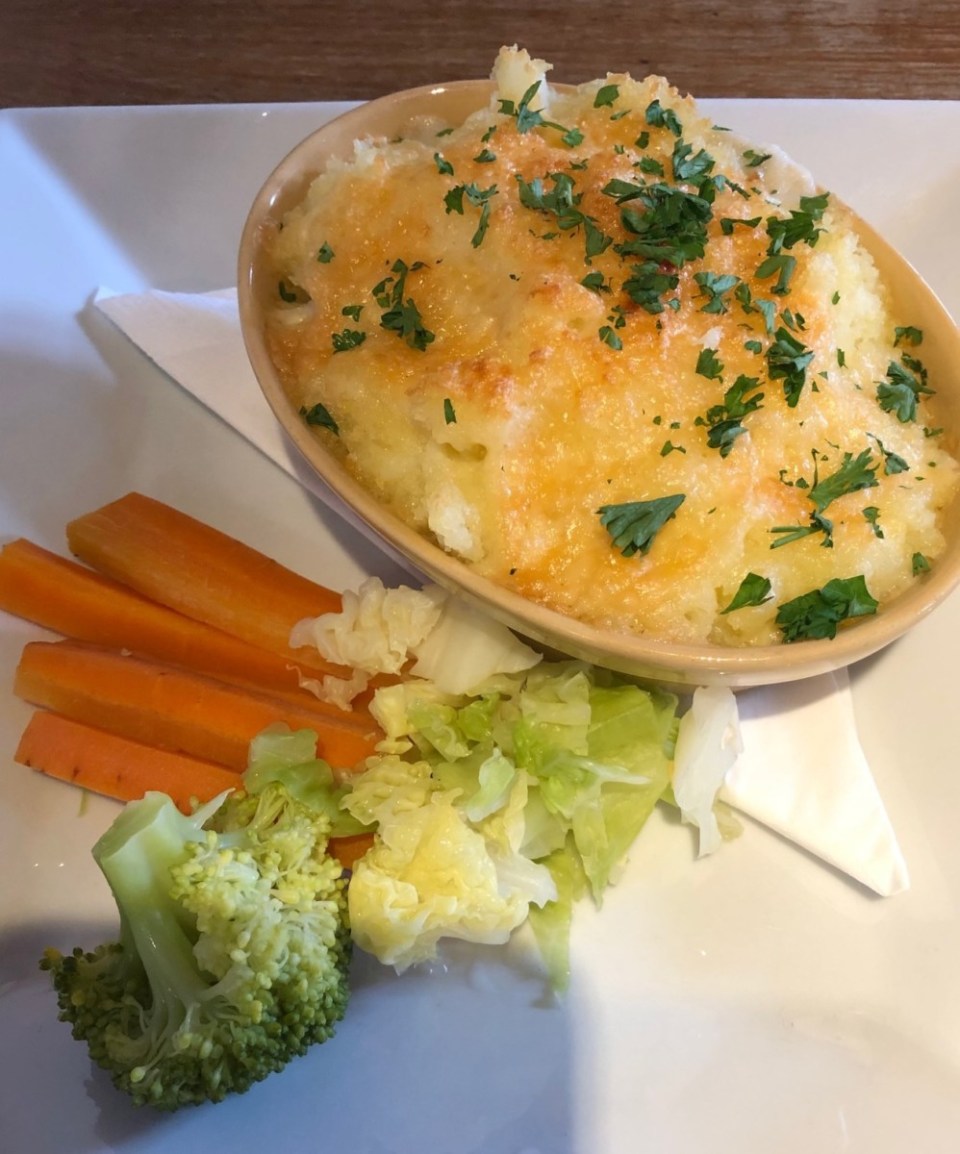 ‘A mix of locally caught white fish with salmon and smoked haddock poached in our own white wine cream and parsley sauce’ ooh nice! ‘topped with real mashed potato and melted cheese’ sounding even better!