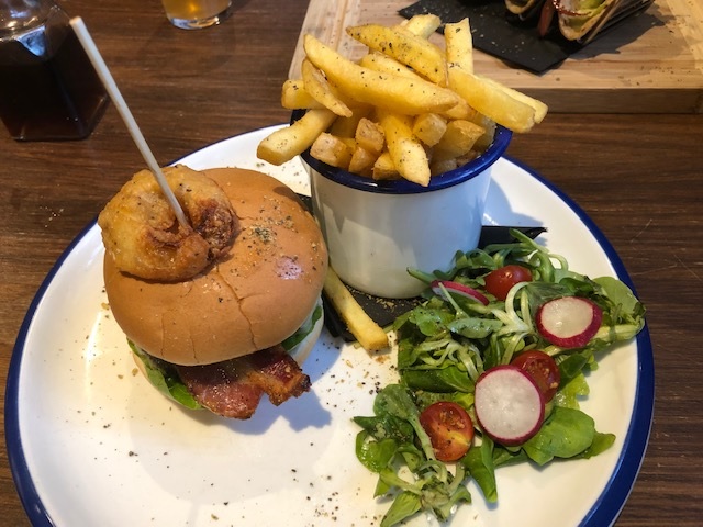 This was listed on the Menu as being ‘homemade chuck beef pattie, Guiness and maple bacon, Monterey Jack cheese, Red Leicester cheese, tomato, gherkins, homemade burger sauce‘ for £13