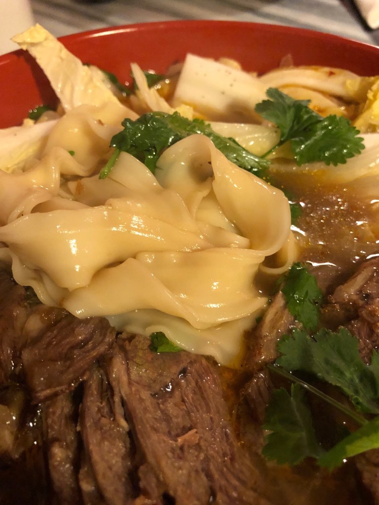 Once I had worked my way through some of the broth and the meat layering the top of the dish I was able to start fishing out the fresh noodles. Based on the menu pictures I had thought that I was going to be getting much thinner noodles, but the bowlful was filled with the thicker ones instead. To be honest I was just as happy with those. I liked that they were freshly made and a little bit chewy like al dente pasta I suppose. They had also started to absorb some of the liquid broth so they were a bit silken and slipped nicely from the chopsticks into my mouth.