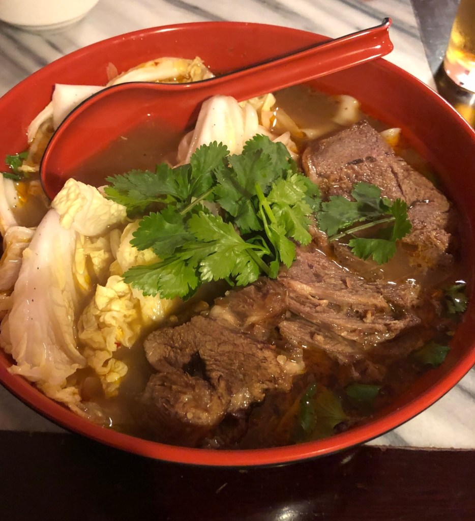 First impressions were looking good! A great big bowlful appeared at the table filled with broth, a very decent amount of sliced stewed beef, lots of cabbage leaf, and a scattering of chopped coriander all hiding the noodles that I hoped lay somewhere beneath the surface.
