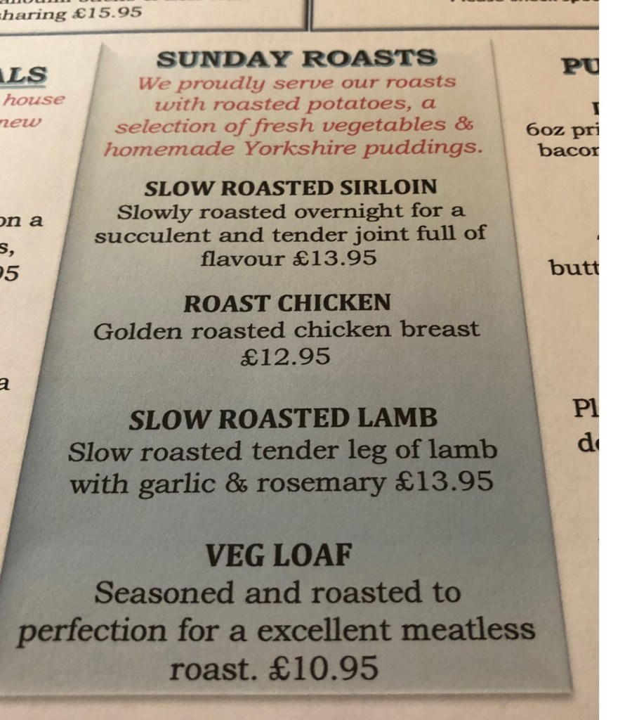 The Sunday Roast section of the Menu declares that they ‘proudly serve our roasts with roasted potatoes, a selection of fresh vegetables & home made Yorkshire puddings.’