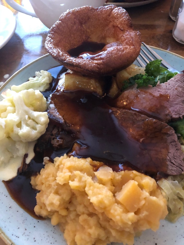 The gravy was generously applied and looking after everyone else on the plate which was filled up with roast potatoes, parsnips, kale, carrots (somewhere I recall), and swede mash too. It was like a smorgasbord of root vegetables vying for my attention.