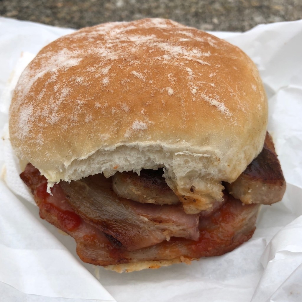 Fillings wise it is packed with sausage and bacon. Two sausages sliced in half layered within slices of well cooked meaty bacon. I asked for ketchup and there was a lot of that too perhaps too much, I had one with brown sauce as well on a different day same story. Next time might just decline the sauce as you don’t really need it!