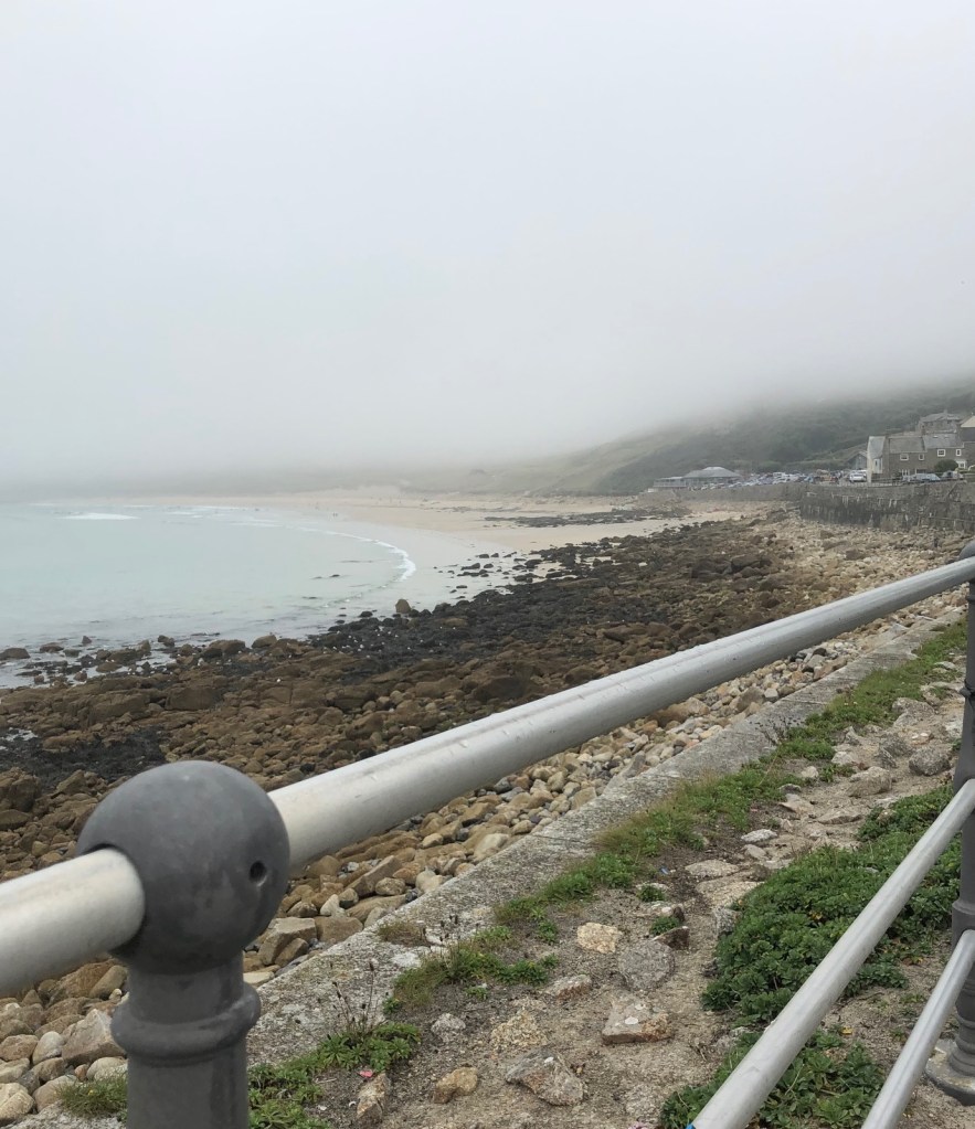 Over the road from the shop are a few tables where you can sit and watch the world go by and take in the views of the cove. In the distance you can just pick out the beach where most hardy souls were paddling or surfing and one of the car parks which we had taken advantage of