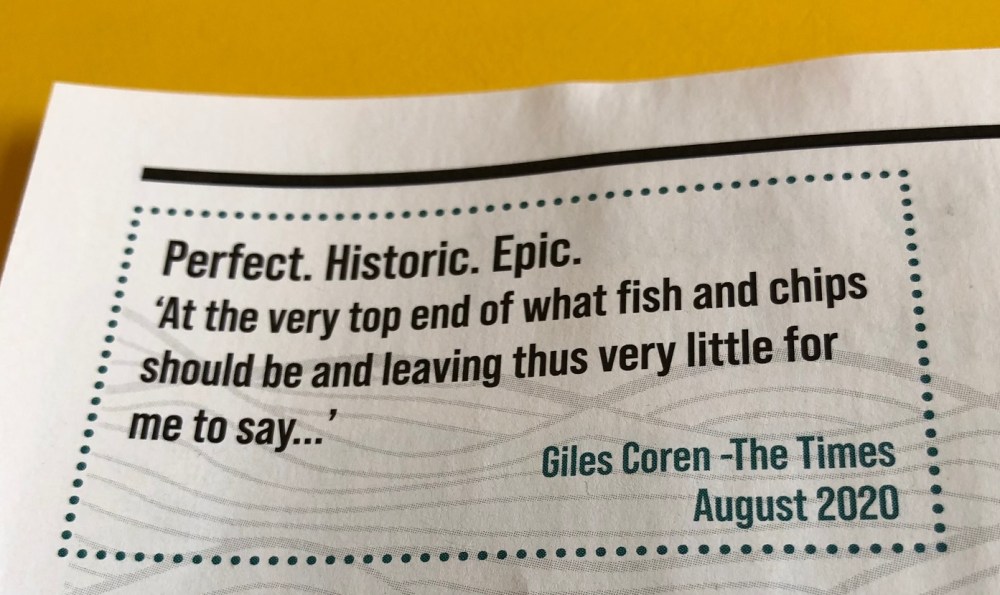 On the paper menu there was a quote from Giles Coren where he describes the meal as “Perfect. Historic. Epic” when he reviewed the place in the Times back in August 2020. I would love to read the article but you have to pay to subscribe to the Times and so I’ll just read the headline 🙂