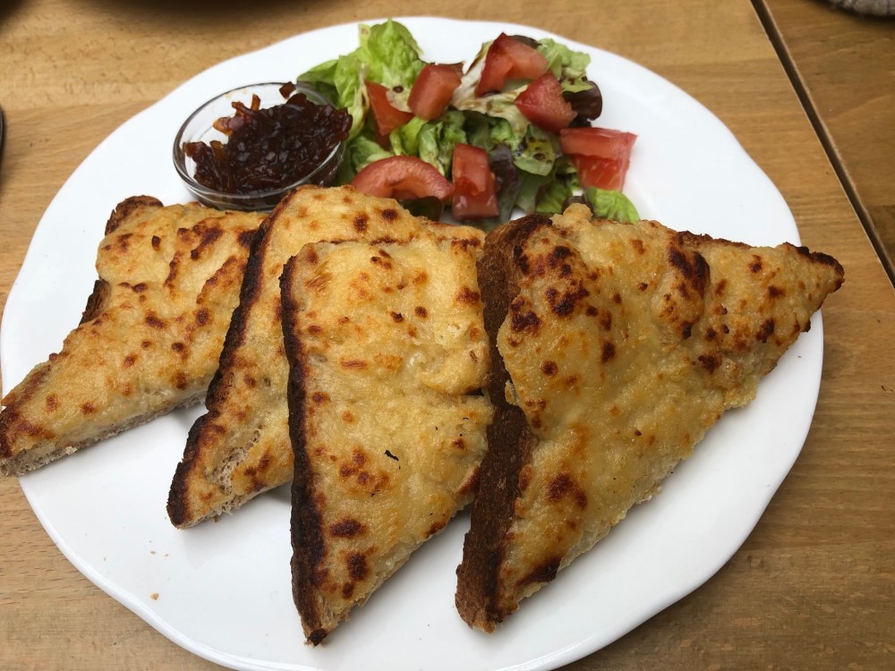 I had the Welsh Rarebit which was offered as one slice for £2.80 or two slices for £5.30, obviously I had two slices! The menu said that it was ‘made fresh on the premises’ which seemed a bit strange as I would have found it hard not to make it fresh each time. Perhaps there are establishments getting it shipped in, actually that would not surprise me at all
