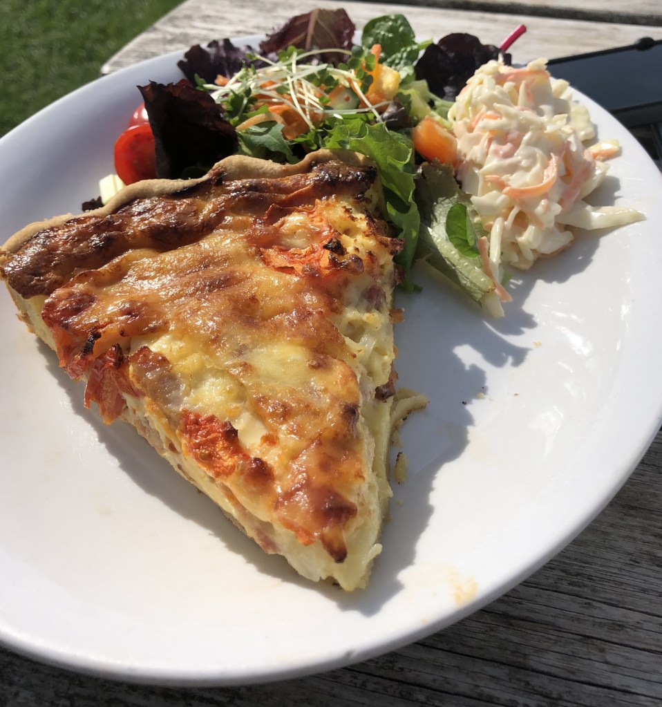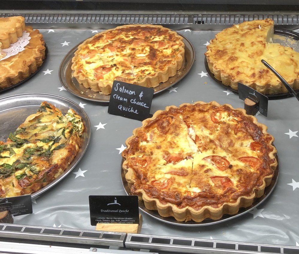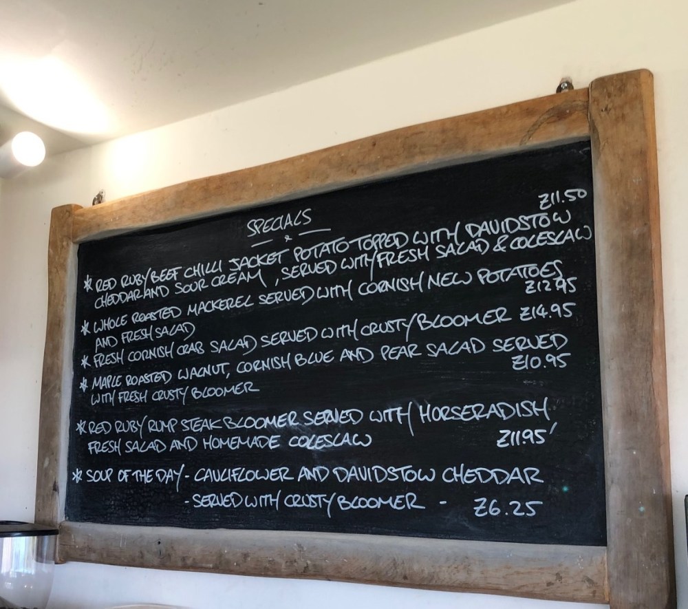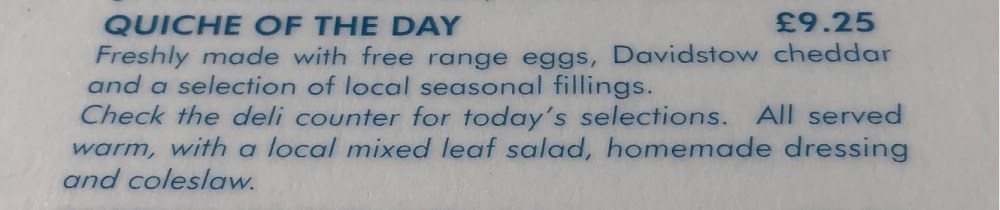 The board outside and the menu mentioned Quiche of the Day ‘Freshly made with free range eggs, Davidstow cheddar and a selection of local seasonal fillings’