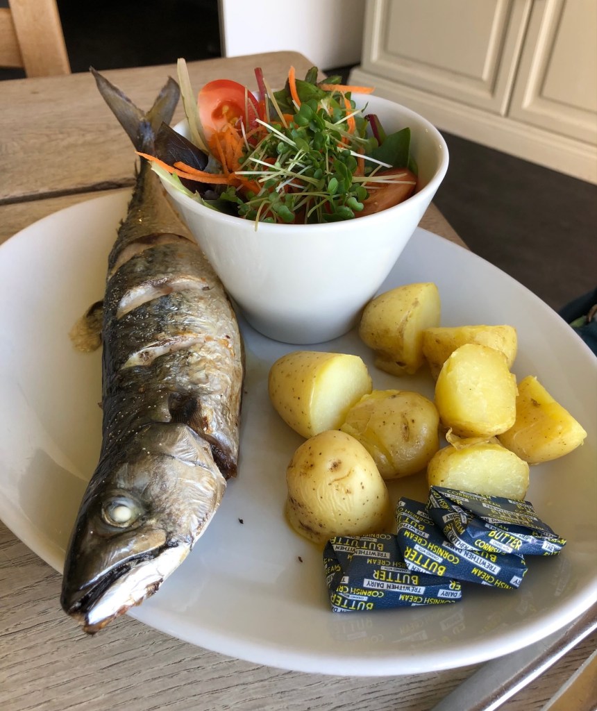 The last visit we made it was the Mackerel that caught our eye so one of us picked that for lunch. Officially listed as “Whole Roasted Mackerel served with Cornish new potatoes and fresh salad” for £12.95 is was as promised a Whole Mackerel