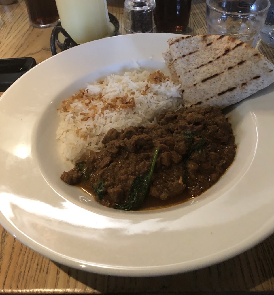 So she chose the ”Lamb karahi” a ‘Lamb and spinach curry with coriander, cumin, and green chillies served with basmati rice’ for £15.95 which did sound rather good on paper