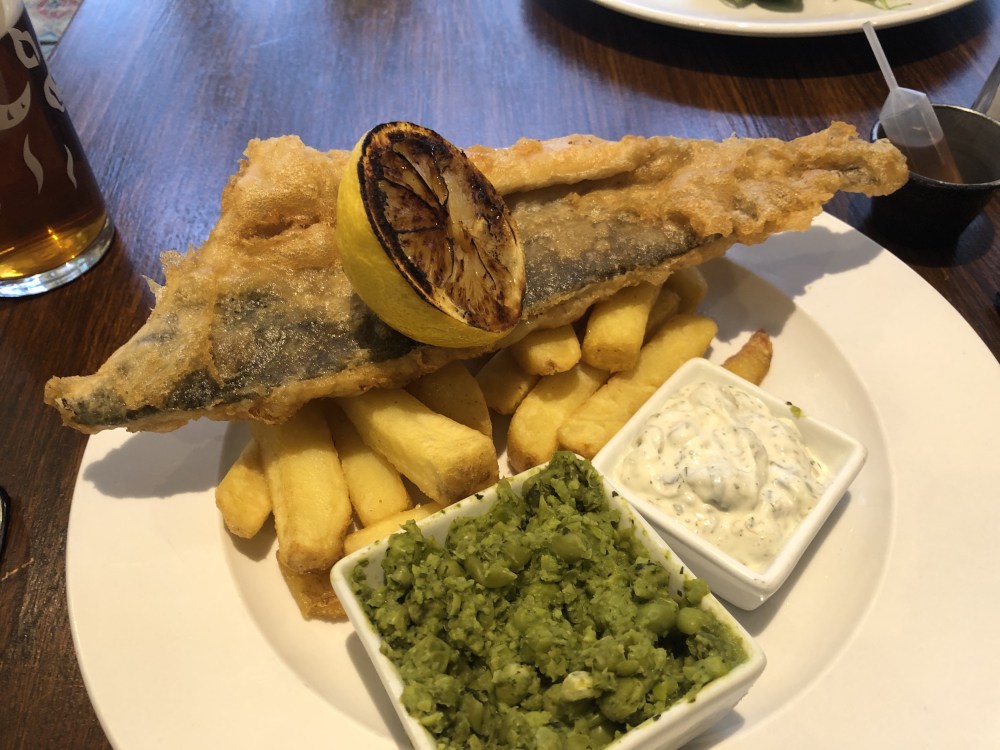 I had the Local Beer Battered Haddock with Mint Peas & Samphire Tartar Sauce for £13.50 which was a rather large plateful. They had tried to hide the chips under the fish but there were so many that it was not possible.