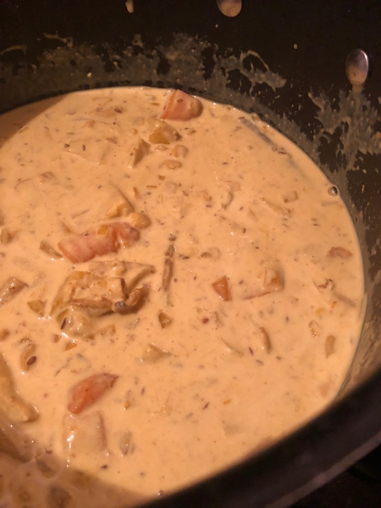 Once the vegetables are cooked to be soft and tender, yet with some bite (or however you like them) it is time to get that creamy korma sauce going.