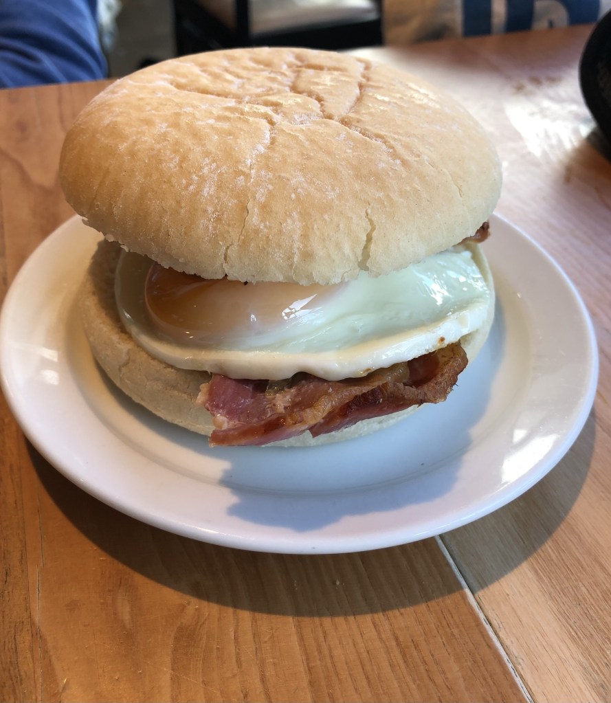 Officially listed on the menu as a ‘flour topped bap‘ containing ‘Back Bacon, Pork sausage & Fried egg ‘for £6.99 it was more reasonable both pricewise and size wise