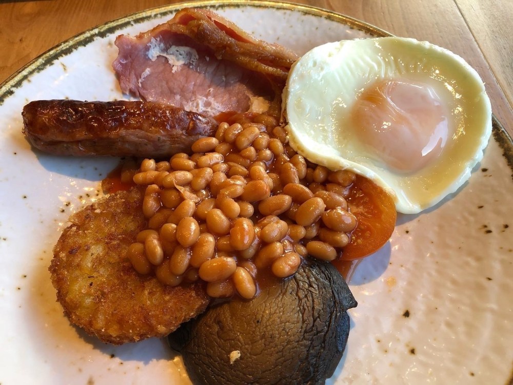The English Breakfast comprising of ‘Pork sausage, two rashers of bacon, fried egg, grilled tomato, roasted mushroom, baked beans and hash brown‘ was my choice