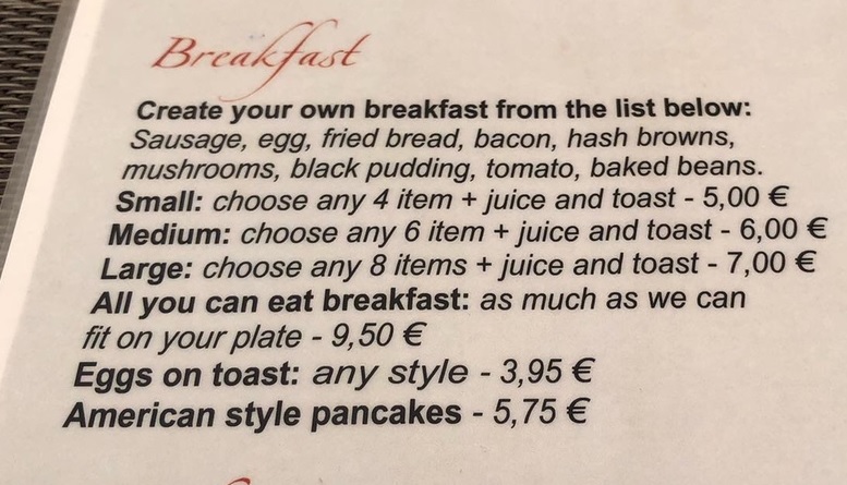 They do also offer an “All you can eat breakfast” where they describe the contents as ‘as much as we can fit on your plate‘.