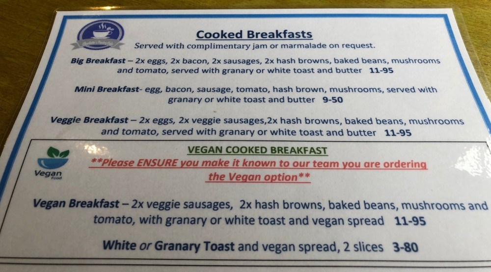 The Big Breakfast was ‘2x eggs, 2x bacon, 2x sausages, 2x hash browns, baked beans, mushrooms and tomato. served with granary or white toast and butter‘ and was priced at £11.95