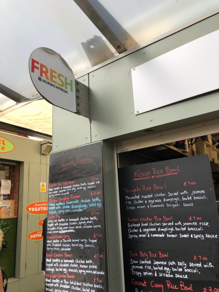 Norwich Fresh is one of many fantastic food vendors you can find in Norwich Market. Located on Row A in Stalls 32 and 34 they offer up a huge selection of ‘Fusion Ramen‘ and ‘Fusion Rice Bowls‘