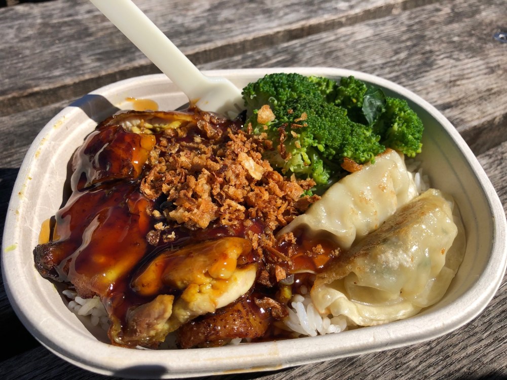 The TERIYAKI CHICKEN RICE BOWL was listed as “Marinated roasted chicken served with jasmine rice, chicken and vegetable dumplings, boiled broccoli, crispy onion and homemade teriyaki sauce“
